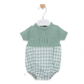 Ranita para bebe corta que combina la parte inferior en tejido de tela con forro interior y la parte superior en tejido dralón con pequeña cenefa decorativa. Presentado en percha